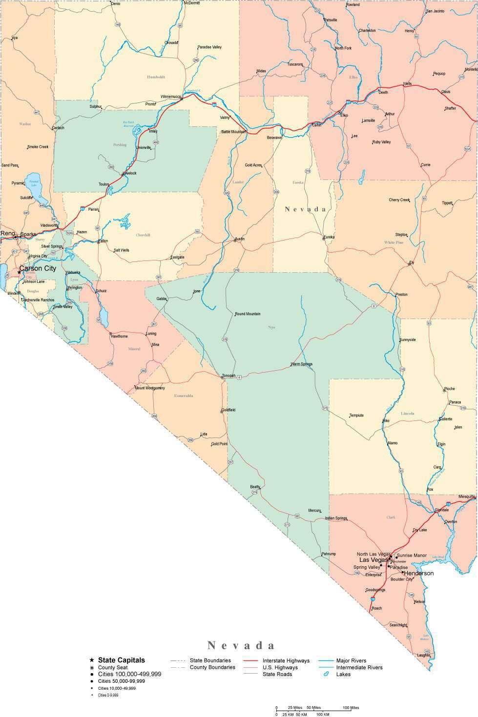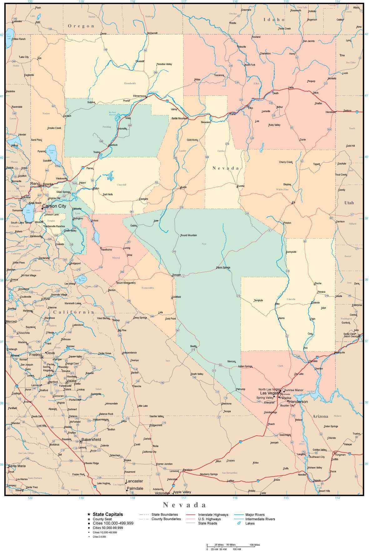Nevada Adobe Illustrator Map with Counties, Cities, County Seats